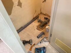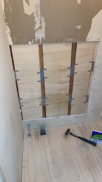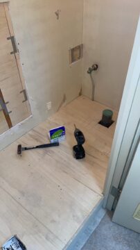 壁面は洗面台を設置する為、下地を入れて補強していきます。