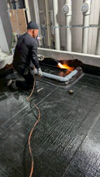 これはバーナーでアスファルトシートを炙って溶かしながら貼り付ける工法です