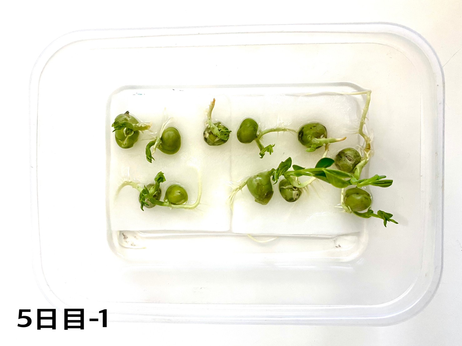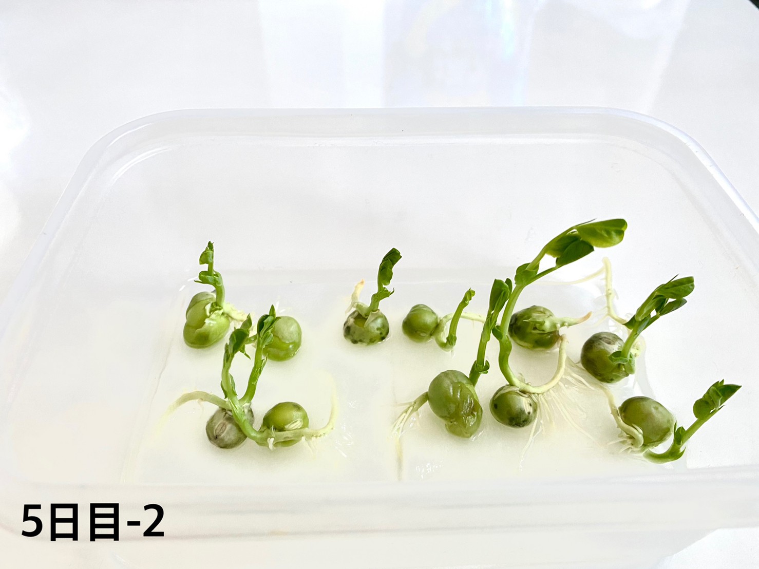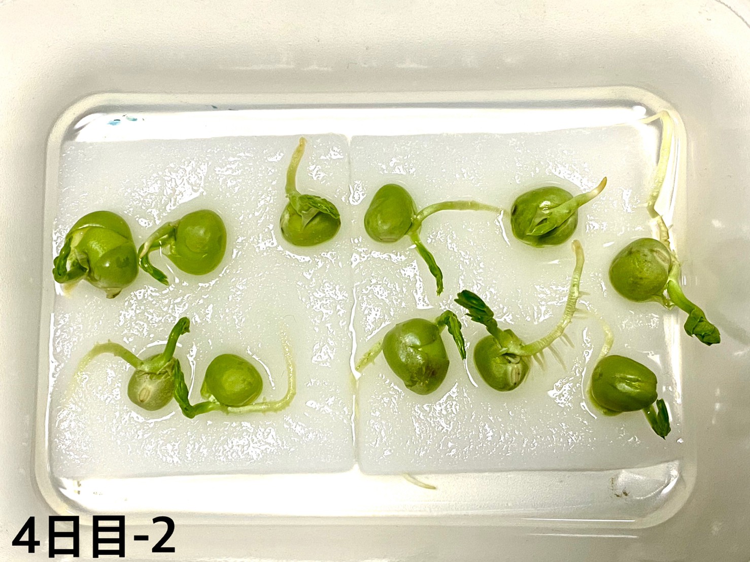 3日目でお豆がぱかっと割れて順調に生長しています。さてさて、4日目はどうなったでしょう?